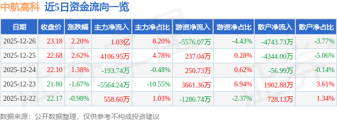 证券之星消息,截至2025年12月26日收盘,中航高科(600862)报收于23.18元,上涨2.2%,换手率3.93%,成交量54.75万手,成交额12.59亿元。