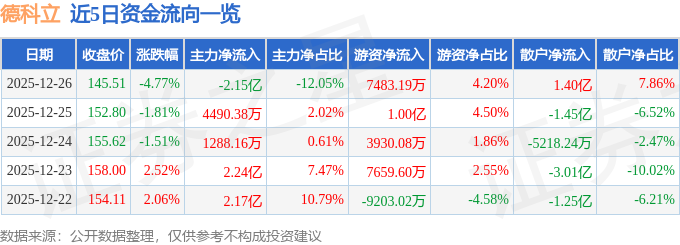 证券之星消息,截至2025年12月26日收盘,德科立(688205)报收于145.51元,下跌4.77%,换手率7.72%,成交量12.22万手,成交额17.83亿元。