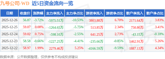 证券之星消息,截至2025年12月26日收盘,九号公司(689009)报收于56.87元,下跌3.72%,换手率1.78%,成交量9.85万手,成交额5.67亿元。