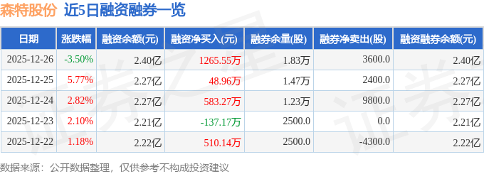 证券之星消息,截至2025年12月26日收盘,森特股份(603098)报收于13.79元,下跌3.5%,换手率2.45%,成交量13.19万手,成交额1.84亿元。