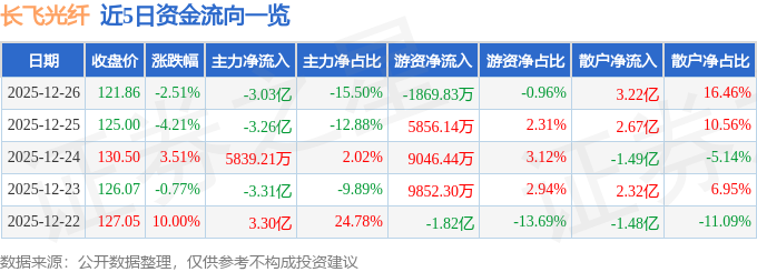 证券之星消息,截至2025年12月26日收盘,长飞光纤(601869)报收于121.86元,下跌2.51%,换手率3.95%,成交量16.05万手,成交额19.54亿元。