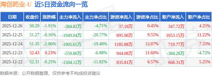 证券之星消息,截至2025年12月26日收盘,海创药业(688302)报收于50.29元,下跌1.91%,换手率1.63%,成交量1.62万手,成交额8172.51万元。