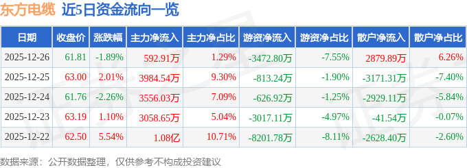 证券之星消息,截至2025年12月26日收盘,东方电缆(603606)报收于61.81元,下跌1.89%,换手率1.08%,成交量7.41万手,成交额4.6亿元。