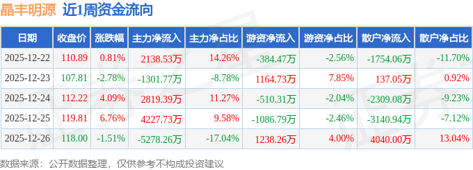 资金流向数据方面,本周晶丰明源主力资金合计净流入2605.62万元,游资资金合计净流入421.42万元,散户资金合计净流出3027.03万元。本周资金流向一览见下表: