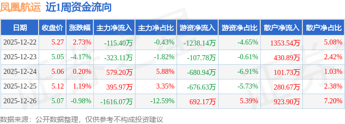 资金流向数据方面,本周凤凰航运主力资金合计净流出1079.41万元,游资资金合计净流出2011.31万元,散户资金合计净流入3090.73万元。本周资金流向一览见下表: