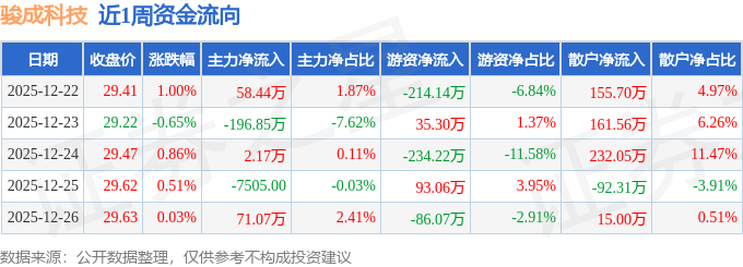 资金流向数据方面,本周骏成科技主力资金合计净流出65.91万元,游资资金合计净流出406.07万元,散户资金合计净流入471.99万元。本周资金流向一览见下表: