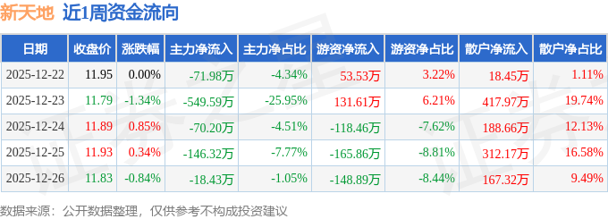资金流向数据方面,本周新天地主力资金合计净流出856.51万元,游资资金合计净流出248.07万元,散户资金合计净流入1104.58万元。本周资金流向一览见下表: