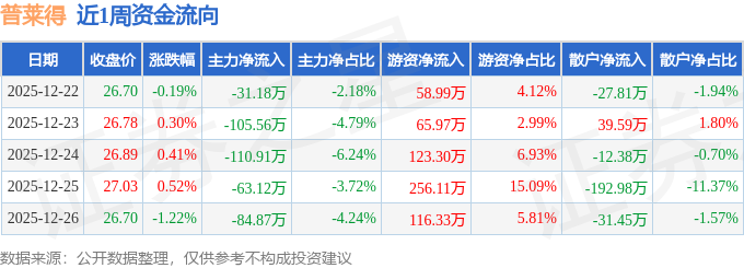 资金流向数据方面,本周普莱得主力资金合计净流出395.65万元,游资资金合计净流入620.7万元,散户资金合计净流出225.05万元。本周资金流向一览见下表: