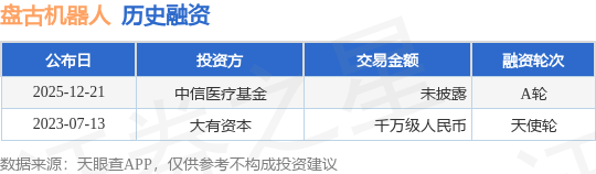 证券之星消息,根据天眼查APP于12月21日公布的信息整理,青岛盘古机器人有限公司A轮融资,融资额未披露,参与投资的机构包括中信医疗基金。