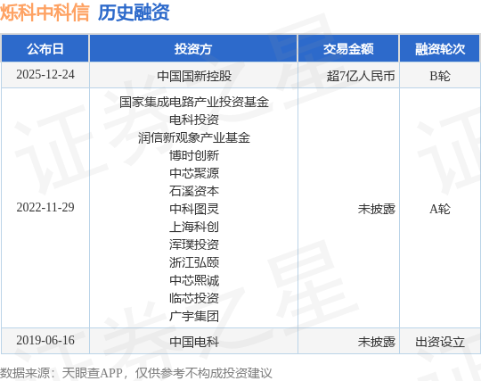 证券之星消息,根据天眼查APP于12月24日公布的信息整理,北京烁科中科信电子装备有限公司B轮融资,融资额超7亿人民币,参与投资的机构包括中国国新控股。