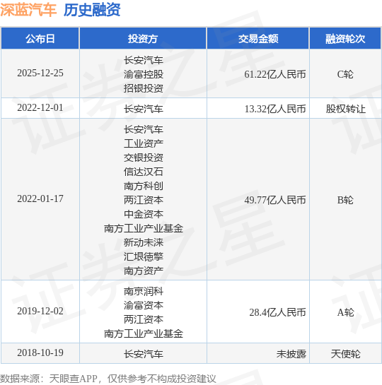 证券之星消息,根据天眼查APP于12月25日公布的信息整理,深蓝汽车科技有限公司C轮融资,融资额61.22亿人民币,参与投资的机构包括长安汽车,渝富控股,招银投资。