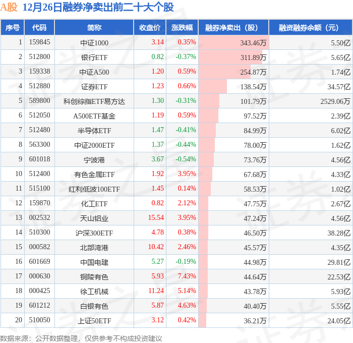 A股融券净卖出前三分别为:中证1000(159845)融券净卖出343.46万股、银行ETF(512800)融券净卖出311.89万股、中证A500(159338)融券净卖出254.87万股,前20具体见下表: