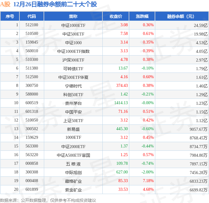 A股融券余额前三分别为:中证1000ETF(512100)融券余额24.59亿元、中证500ETF(510500)融券余额19.98亿元、中证1000(159845)融券余额4.53亿元,前20具体见下表: