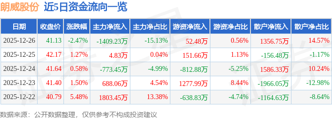 证券之星消息,截至2025年12月26日收盘,朗威股份(301202)报收于41.13元,下跌2.47%,换手率6.06%,成交量2.25万手,成交额9314.6万元。