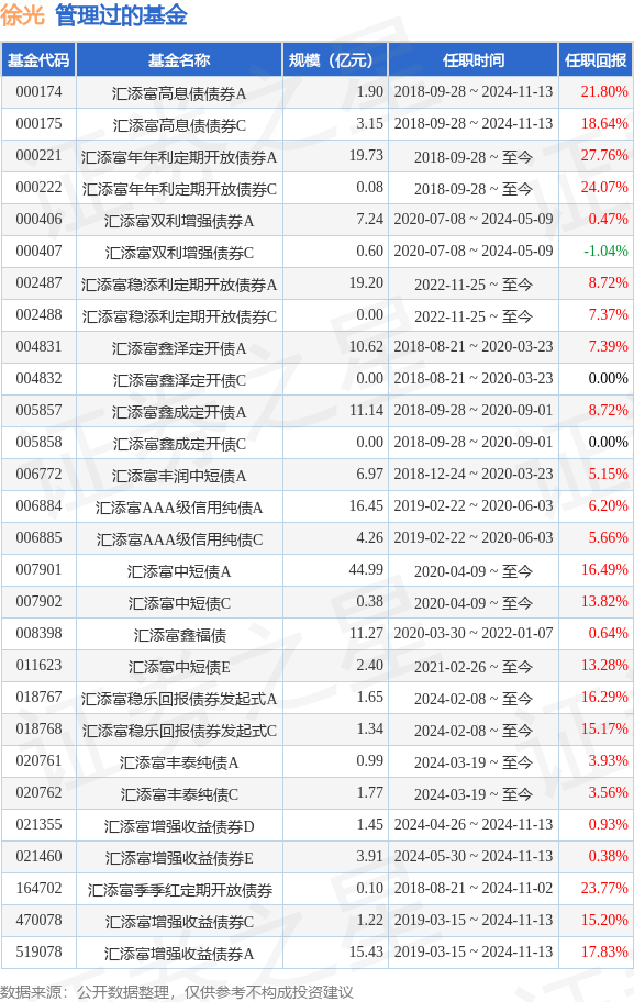 徐光先生:中国国籍。美国伊利诺伊理工学院金融学硕士。2012年12月加入汇添富基金管理股份有限公司,历任债券交易员、高级债券交易员。2024年2月2日至今任汇添富稳元回报债券型发起式证券投资基金的基金经理助理。2024年2月2日至今任汇添富稳丰回报债券型发起式证券投资基金的基金经理助理。2018年8月21日至今任汇添富季季红定期开放债券型证券投资基金的基金经理。2018年8月21日至2020年3月23日任汇添富鑫泽定期开放债券型发起式证券投资基金的基金经理。2018年9月28日至2024年11月13日任汇添富高息债债券型证券投资基金的基金经理。2018年9月28日至今任汇添富年年利定期开放债券型证券投资基金的基金经理。2018年9月28日至2020年9月1日任汇添富鑫成定期开放债券型发起式证券投资基金的基金经理。2018年12月24日至2020年3月23日任汇添富丰润中短债债券型证券投资基金的基金经理。2019年2月22日至2020年6月3日任汇添富AAA级信用纯债债券型证券投资基金的基金经理。2019年3月15日至2024年11月13日任汇添富增强收益债券型证券投资基金的基金经理。2020年3月30日至2022年1月7日任汇添富鑫福债券型证券投资基金的基金经理。2020年4月9日至今任汇添富中短债债券型证券投资基金的基金经理。2020年7月8日至2024年5月9日任汇添富双利增强债券型证券投资基金的基金经理。2022年11月25日至今任汇添富稳健添利定期开放债券型证券投资基金的基金经理。2024年2月8日至今任汇添富稳乐回报债券型发起式证券投资基金的基金经理。2024年3月19日至今任汇添富丰泰纯债债券型证券投资基金的基金经理。