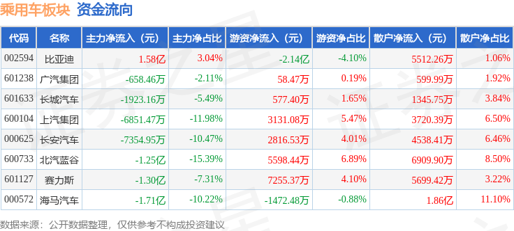 从资金流向上来看,当日乘用车板块主力资金净流出4.35亿元,游资资金净流出3387.28万元,散户资金净流入4.69亿元。乘用车板块个股资金流向见下表: