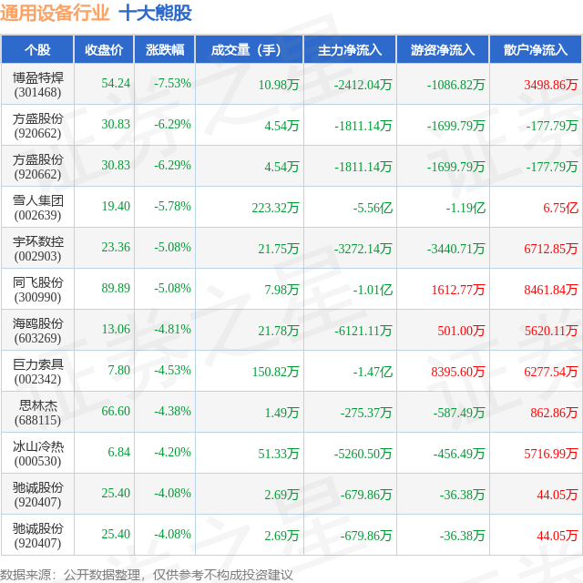 个股表现方面,通用设备行业当日领跌股为博盈特焊(301468),该股当日报收54.24,下跌7.53%,成交量10.98万,主力资金净流出2412.04万元。方盛股份(920662)以下跌6.29%紧随其后,该股当日成交量4.54万,主力资金净流出1811.14万元。除此之外,方盛股份(920662)、雪人集团(002639)、宇环数控(002903)均进入当日熊股之列。具体个股列表见下表: