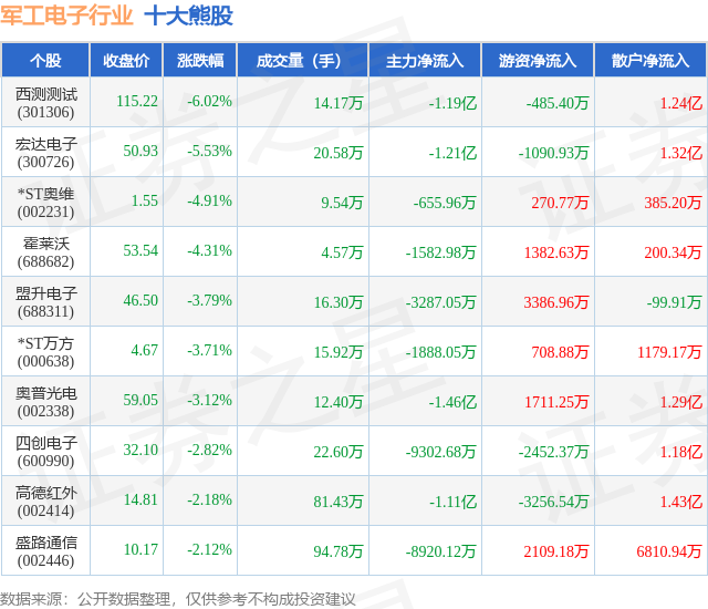 个股表现方面,军工电子行业当日领跌股为西测测试(301306),该股当日报收115.22,下跌6.02%,成交量14.17万,主力资金净流出1.19亿元。宏达电子(300726)以下跌5.53%紧随其后,该股当日成交量20.58万,主力资金净流出1.21亿元。除此之外,*ST奥维(002231)、霍莱沃(688682)、盟升电子(688311)均进入当日熊股之列。具体个股列表见下表: