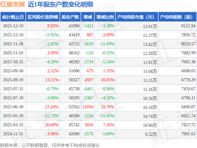 证券之星消息,近日红星发展披露,截至2025年12月19日公司股东户数为4.2万户,较12月10日减少1423.0户,减幅为3.28%。户均持股数量由上期的7857.0股增加至8123.0股,户均持股市值为13.91万元。