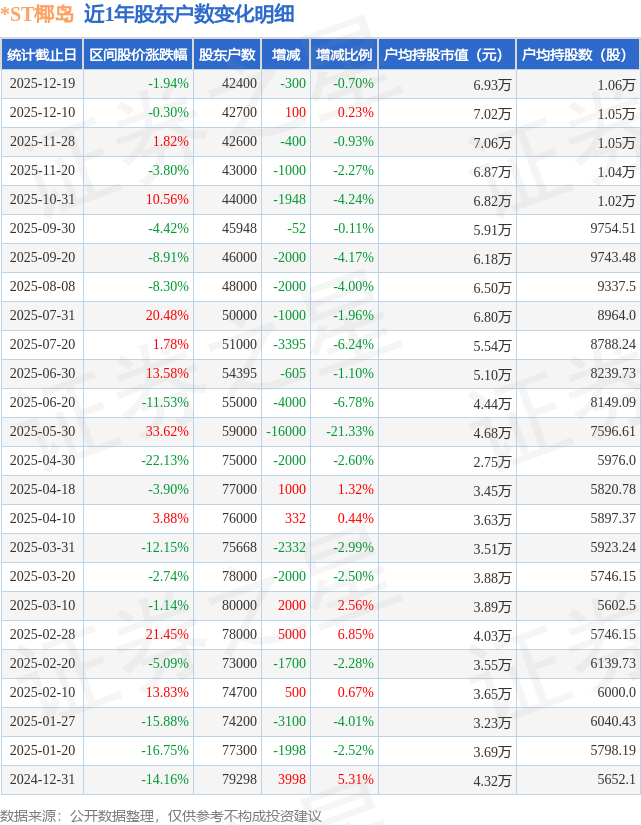 从股价来看,2025年12月10日至2025年12月19日,*ST椰岛区间跌幅为1.94%,在此期间股东户数减少300.0户,减幅为0.7%。