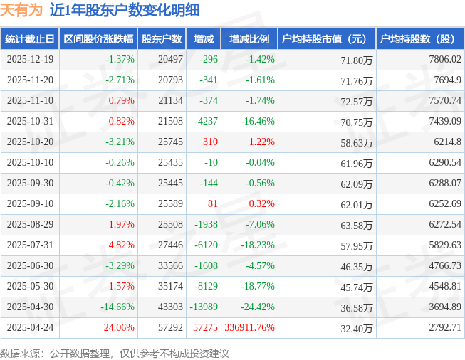 从股价来看,2025年11月20日至2025年12月19日,天有为区间跌幅为1.37%,在此期间股东户数减少296.0户,减幅为1.42%。