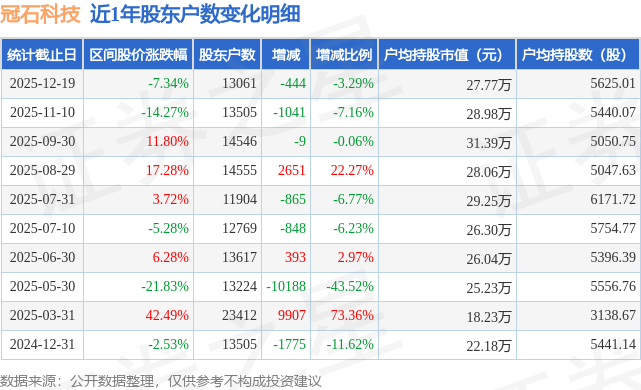 证券之星消息,近日冠石科技披露,截至2025年12月19日公司股东户数为1.31万户,较11月10日减少444.0户,减幅为3.29%。户均持股数量由上期的5440.0股增加至5625.0股,户均持股市值为27.77万元。