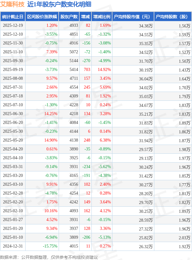 证券之星消息,近日艾隆科技披露,截至2025年12月19日公司股东户数为4933.0户,较12月10日增加82.0户,增幅为1.69%。户均持股数量由上期的1.59万股减少至1.56万股,户均持股市值为34.38万元。