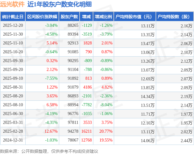 从股价来看,2025年11月30日至2025年12月20日,远光软件区间跌幅为3.04%,在此期间股东户数减少1129.0户,减幅为1.26%。