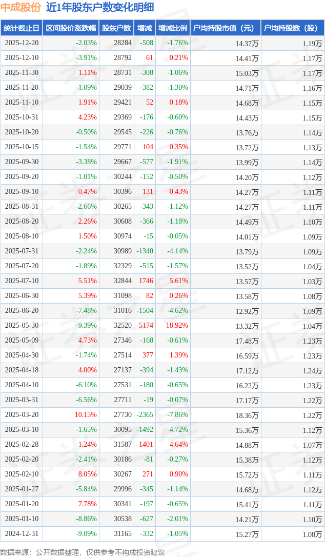从股价来看,2025年12月10日至2025年12月20日,中成股份区间跌幅为2.03%,在此期间股东户数减少508.0户,减幅为1.76%。