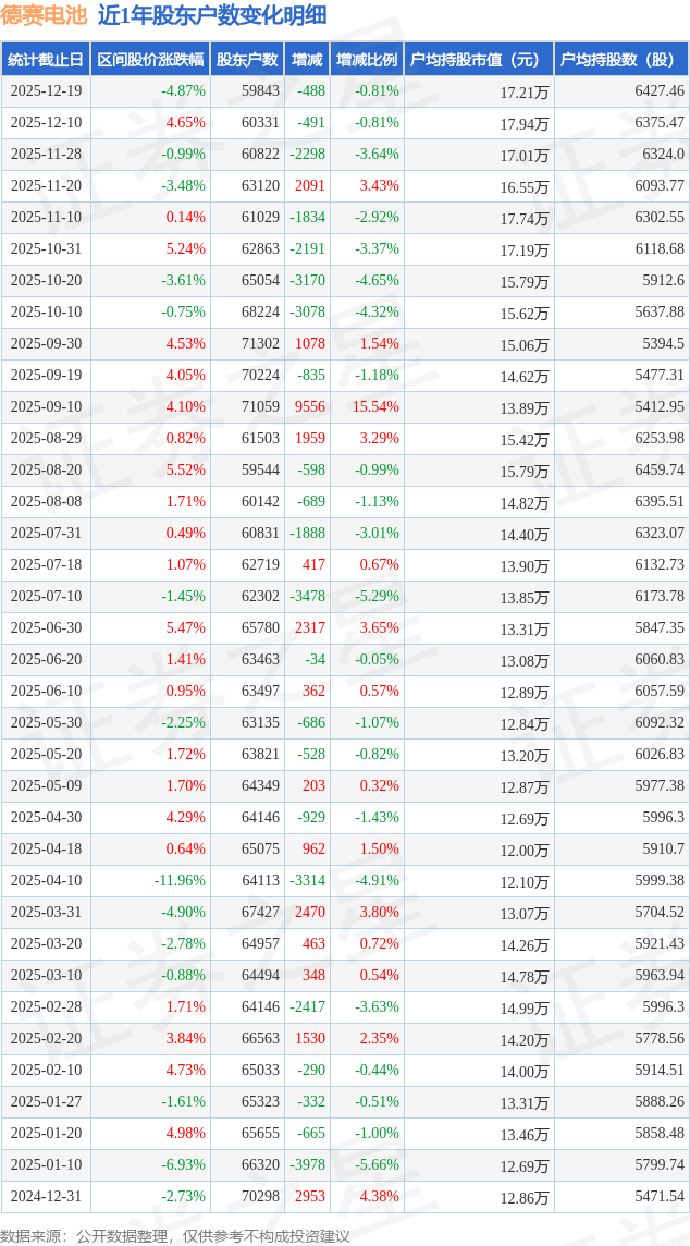 从股价来看,2025年12月10日至2025年12月19日,德赛电池区间跌幅为4.87%,在此期间股东户数减少488.0户,减幅为0.81%。