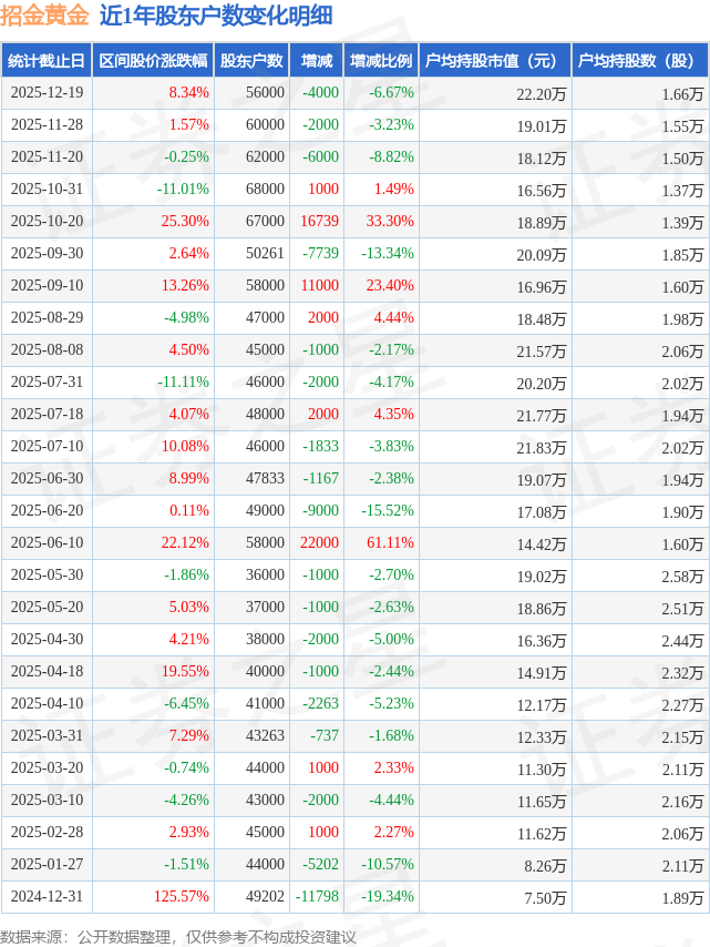 从股价来看,2025年12月10日至2025年12月19日,招金黄金区间涨幅为8.34%,在此期间股东户数减少4000.0户,减幅为6.67%。