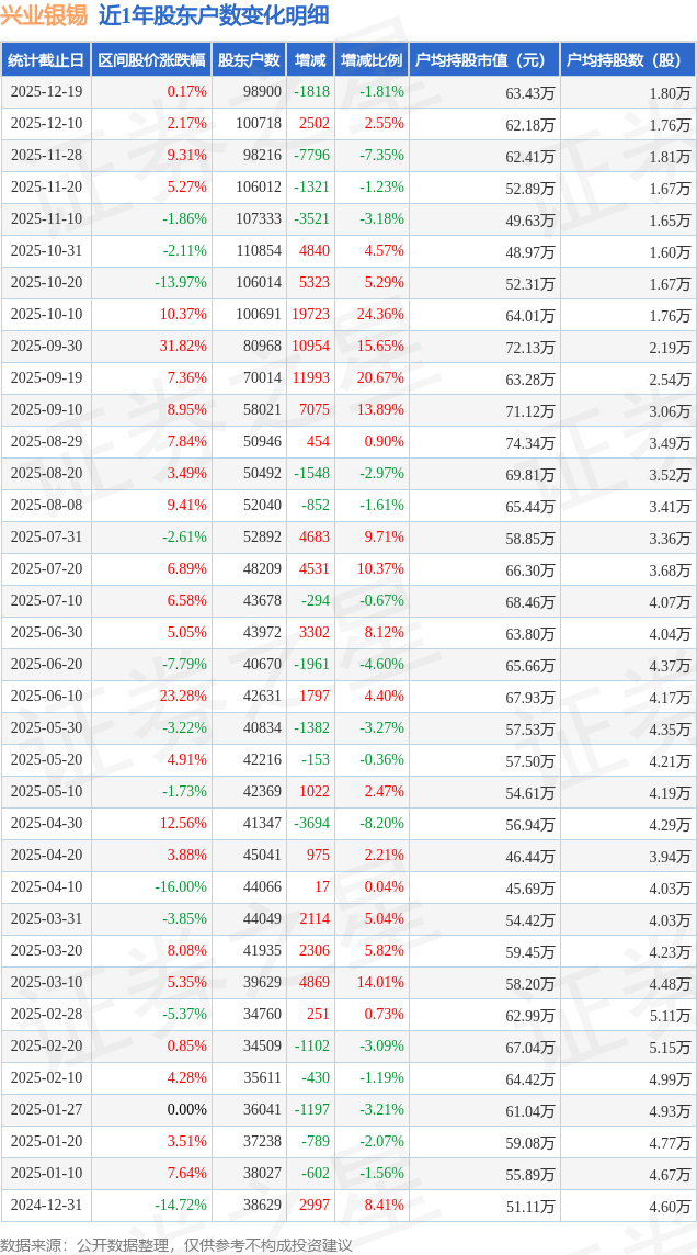 从股价来看,2025年12月10日至2025年12月19日,兴业银锡区间涨幅为0.17%,在此期间股东户数减少1818.0户,减幅为1.81%。