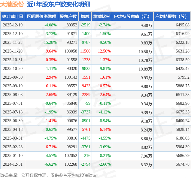 从股价来看,2025年12月10日至2025年12月19日,大港股份区间跌幅为4.08%,在此期间股东户数减少2519.0户,减幅为2.74%。