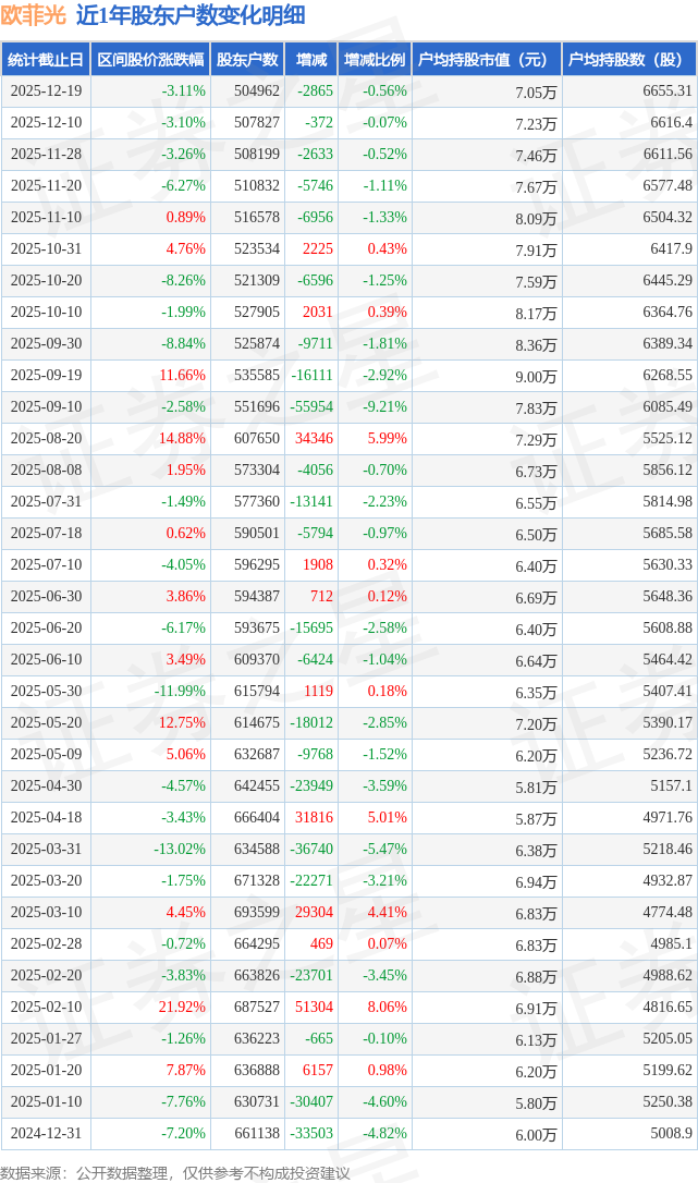 从股价来看,2025年12月10日至2025年12月19日,欧菲光区间跌幅为3.11%,在此期间股东户数减少2865.0户,减幅为0.56%。