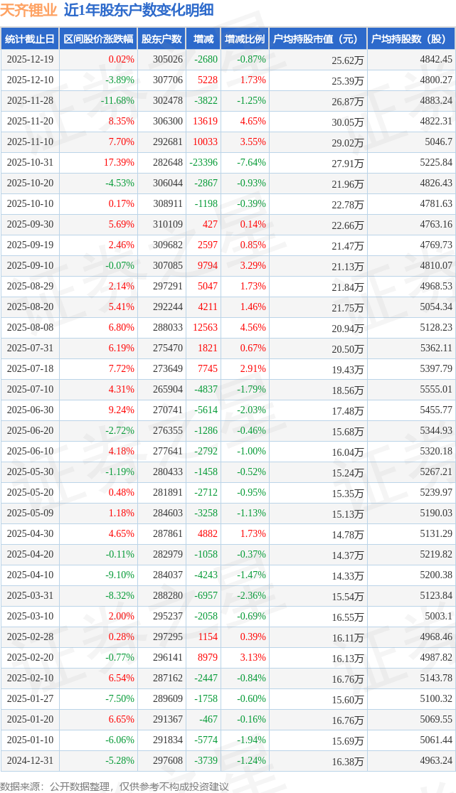 从股价来看,2025年12月10日至2025年12月19日,天齐锂业区间涨幅为0.02%,在此期间股东户数减少2680.0户,减幅为0.87%。
