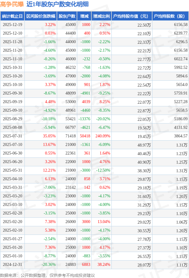 从股价来看,2025年12月10日至2025年12月19日,高争民爆区间涨幅为3.22%,在此期间股东户数增加1000.0户,增幅为2.27%。