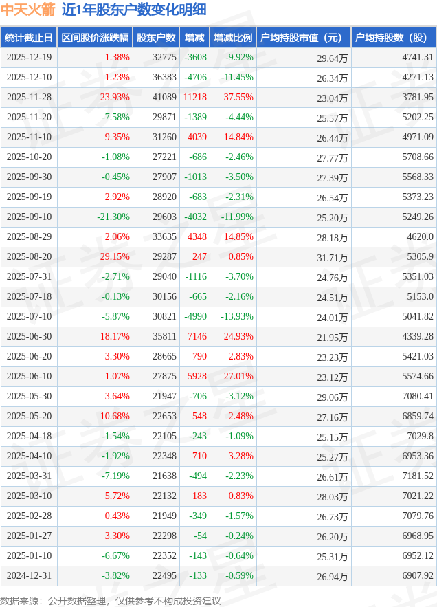 从股价来看,2025年12月10日至2025年12月19日,中天火箭区间涨幅为1.38%,在此期间股东户数减少3608.0户,减幅为9.92%。