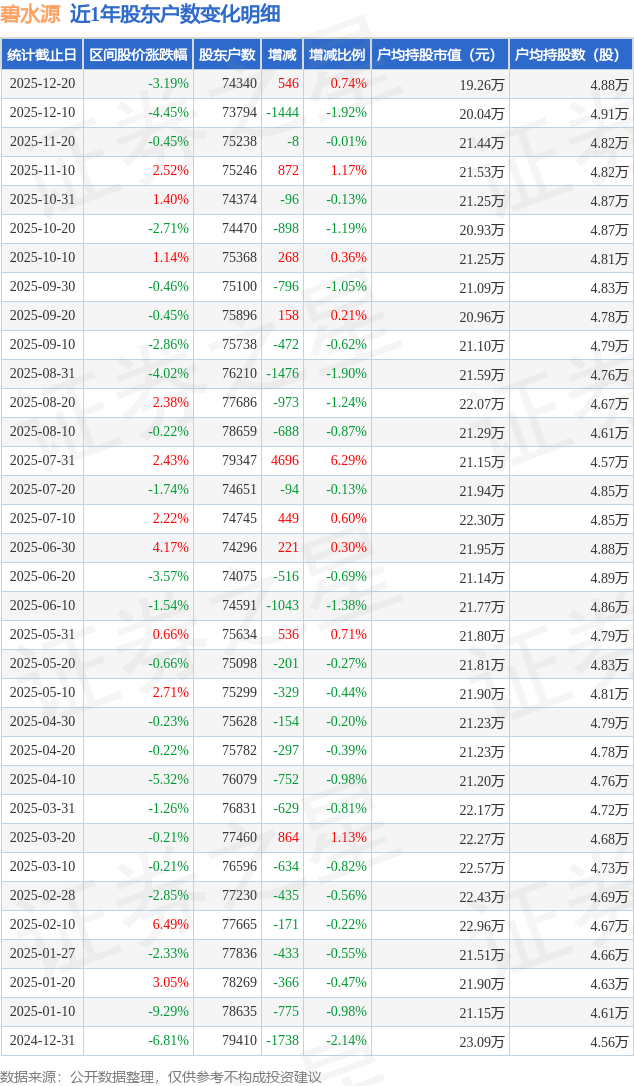 从股价来看,2025年12月10日至2025年12月20日,碧水源区间跌幅为3.19%,在此期间股东户数增加546.0户,增幅为0.74%。