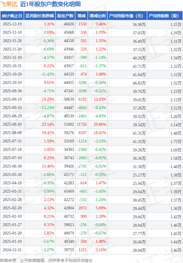 从股价来看,2025年12月10日至2025年12月19日,飞荣达区间涨幅为3.31%,在此期间股东户数增加1558.0户,增幅为3.46%。