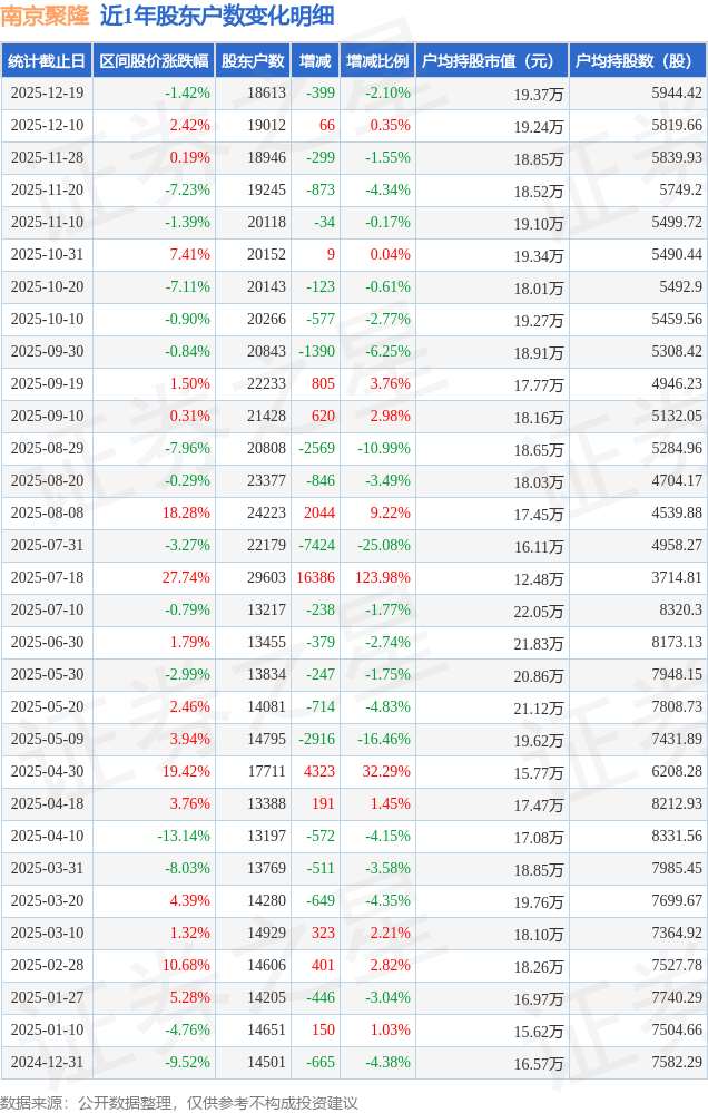 从股价来看,2025年12月10日至2025年12月19日,南京聚隆区间跌幅为1.42%,在此期间股东户数减少399.0户,减幅为2.1%。
