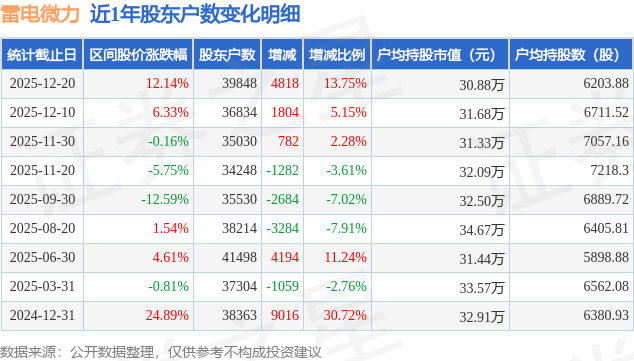 从股价来看,2025年11月30日至2025年12月20日,雷电微力区间涨幅为12.14%,在此期间股东户数增加4818.0户,增幅为13.75%。
