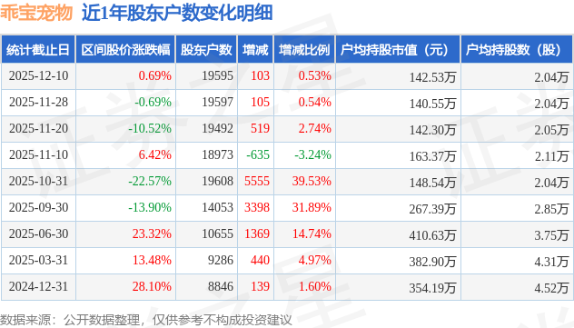从股价来看,2025年11月20日至2025年12月10日,乖宝宠物区间涨幅为0.69%,在此期间股东户数增加103.0户,增幅为0.53%。