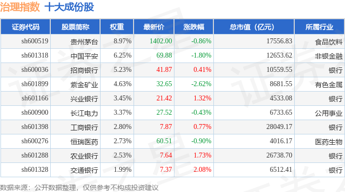 治理指数(000019)十大成份股详情如下: