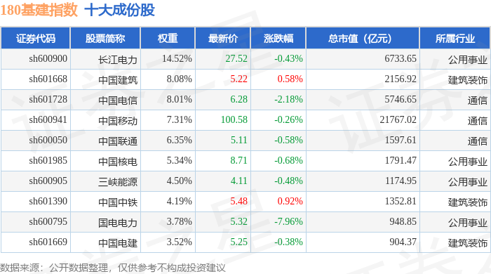 证券之星消息,12月29日,180基建(000025)指数报收于1771.13点,跌0.87%,成交266.79亿元,换手率0.57%。当日该指数成份股中,上涨的有7家,中国卫通以5.97%的涨幅领涨,下跌的有25家,国电电力以7.96%的跌幅领跌。