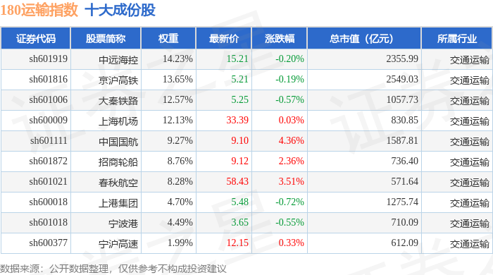 180运输(000027)指数十大成份股详情如下: