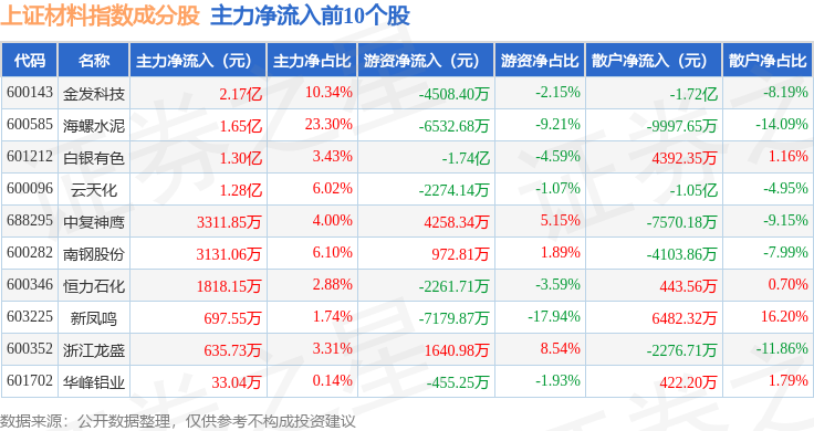 资金流向方面,上证材料(000033)指数成份股当日主力资金净流出合计51.74亿元,游资资金净流入合计12.83亿元,散户资金净流入合计38.91亿元。成份股资金流向详情见下表: