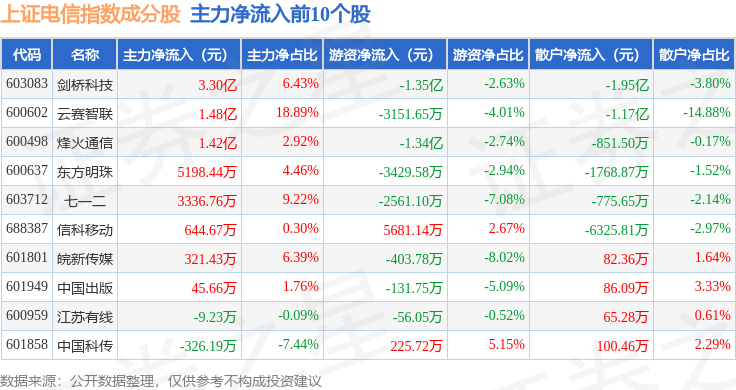资金流向方面,上证电信(000040)指数成份股当日主力资金净流出合计21.77亿元,游资资金净流入合计9.16亿元,散户资金净流入合计12.61亿元。成份股资金流向详情见下表: