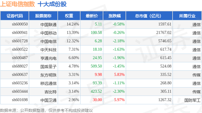 证券之星消息,12月29日,上证电信(000040)指数报收于3946.64点,跌0.11%,成交402.44亿元,换手率1.04%。当日该指数成份股中,上涨的有9家,剑桥科技以6.33%的涨幅领涨,下跌的有23家,山东出版以2.44%的跌幅领跌。