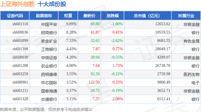 证券之星消息,12月29日,上证海外(000054)指数报收于1606.76点,跌0.49%,成交1036.49亿元,换手率0.34%。当日该指数成份股中,上涨的有25家,中国国航以4.36%的涨幅领涨,下跌的有40家,华能国际以5.07%的跌幅领跌。