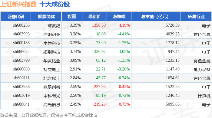 证券之星消息,12月29日,上证新兴(000067)指数报收于8860.57点,跌0.22%,成交1249.94亿元,换手率1.29%。当日该指数成份股中,上涨的有16家,中国卫通以5.97%的涨幅领涨,下跌的有33家,洛阳钼业以4.41%的跌幅领跌。